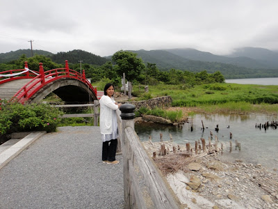 On 29th June, hubby and I left our home in Yurihonjo City at about 8 am. Osorezan is located about 350 kilometers north-northeast of our home and it took us about 6 hours to reach Osorezan area by our car. Several kilometers before reaching Bodaiji Temple on Osorezan, we saw a brook, two statues, and a picturesque red colored bridge. The scenery all around us was strikingly beautiful. So we stopped our car and got out to enjoy the sceneries and the bridge. According to the Buddhist beliefs, Osorezan marks the entrance to hell. A brook named Sanzu no kawa or the ‘River of three crossings’ marks the entrance to the afterlife and is believed to be the boundary between the realms of the living and the dead. The official name of the brook is Shozugawa. Across the brook is a beautiful arched red wooden bridge, which all the souls have to cross. There are three ways of crossing over the brook. If a person has lived a good life, he can walk across the bridge and easily transition into the afterlife. If a person has lived a mediocre life, he can walk across the ford (shallow place) in the brook. However, if a person has lived a bad life, he has to wade through the waters of the brook filled with demons, dragons, and snakes. On the banks of Sanzu no kawa brook, there is a big tree under which two demons stand guarding the brook. A female demon named Datsueba strips the clothes of the dead and the male demon named Keneo weighs the clothes on tree branches to judge the Karma of the dead and decide how they should cross into the afterlife. Afterwards, the dead soul has to pass through Osorezan Hell to finally reach Lake Usori Paradise. We loved the statues of the demons. Hubby wished to walk cross the symbolic red bridge, but I told him not to as I felt a bit uncomfortable about it. However, I saw many visitors who walked across the bridge.