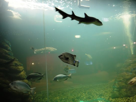 I am sitting next to the huge aquarium