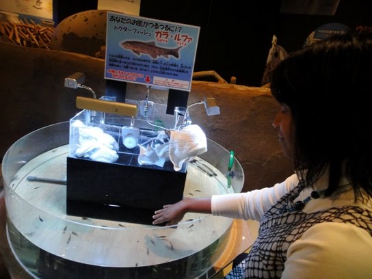 At 9 am we bought tickets worth 300 Yen per person as admission fee for Marient Museum and entered inside. The exhibits of the museum are located at the third floor of the building. As soon as we entered the third floor, we saw that people were busy putting their hands in a water tank which contained many tiny fishes named doctor fish (also called Garra rufa). These are toothless fishes and known to consume the dead areas of human skin. Nowadays in Japan, there are many spas which offer pedicure and manicure services using doctor fish. Hubby and I put our hands in the water tank where the doctor fishes nibbled away our dead skin. The fishes were tickling my hand and so I could not keep my hand inside the water tank even for one minute. In fact, manicure using doctor fish was the highlight of our visit to the museum. I compiled a video of us putting our hands inside the water tank containing many doctor fishes.